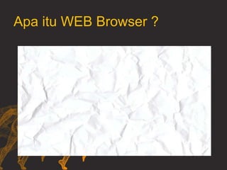 Web browser adalah program yang digunakan untuk membuka halaman website dan menjelajahi internet. Beberapa contoh browser populer adalah Mozilla Firefox, Internet Explorer, dan Opera. Search engine seperti Google dan Yahoo memiliki database yang memuat informasi dari internet untuk memudahkan pencarian.