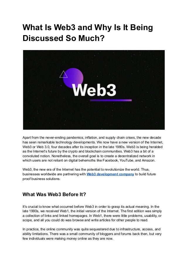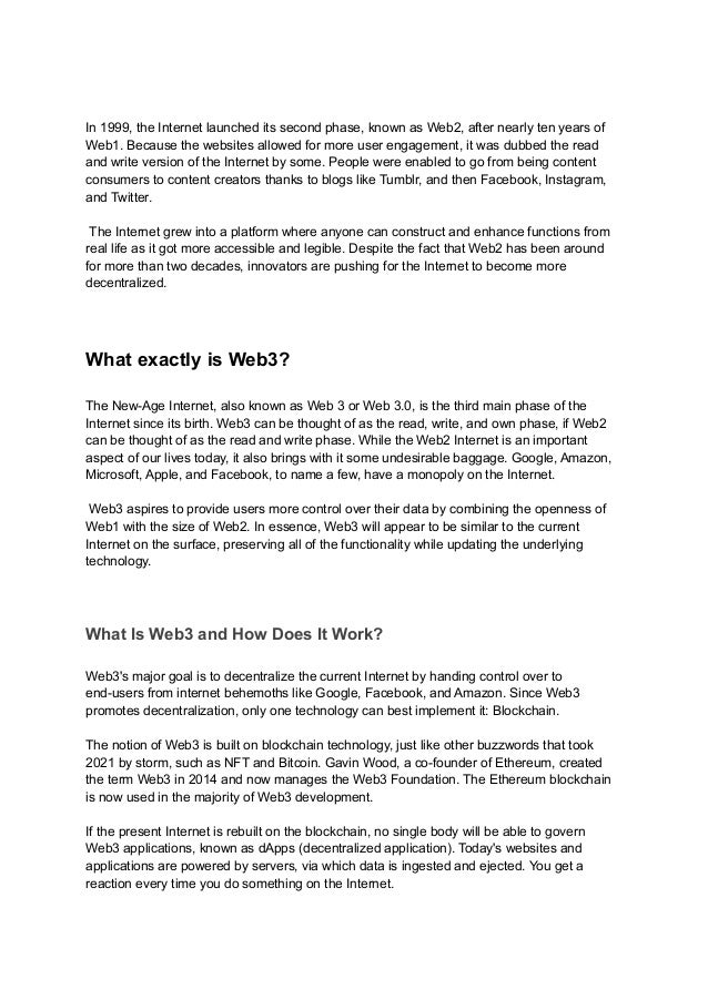 Web3, or web 3.0, represents the third phase of the internet, emphasizing decentralization to empower users and reduce reliance on major corporations. It leverages blockchain technology to enhance control over personal data and aims to merge aspects of web1 and web2 while facilitating the emergence of decentralized applications (dApps). Despite its potential, the transition to web3 will likely be gradual, with ongoing influence from established tech giants.
