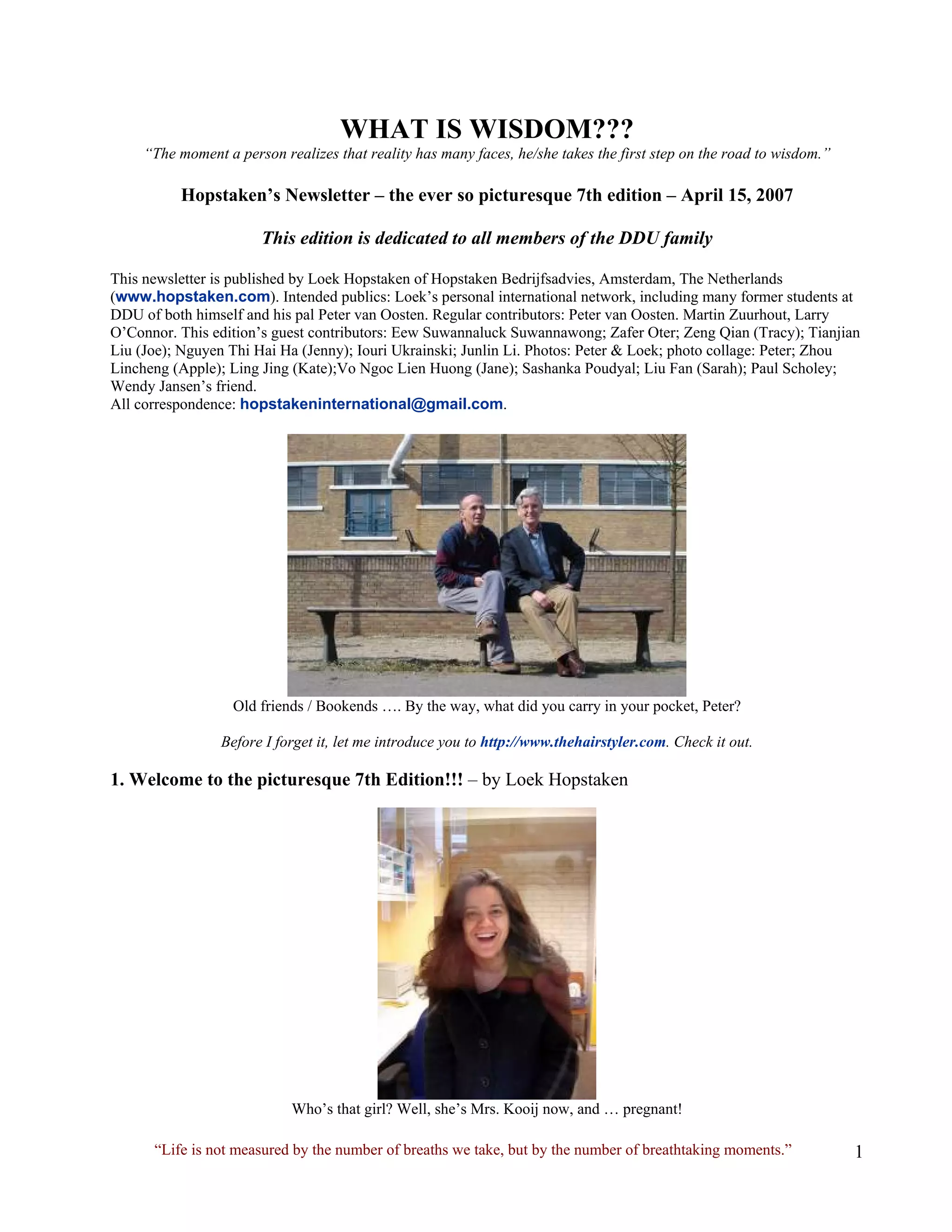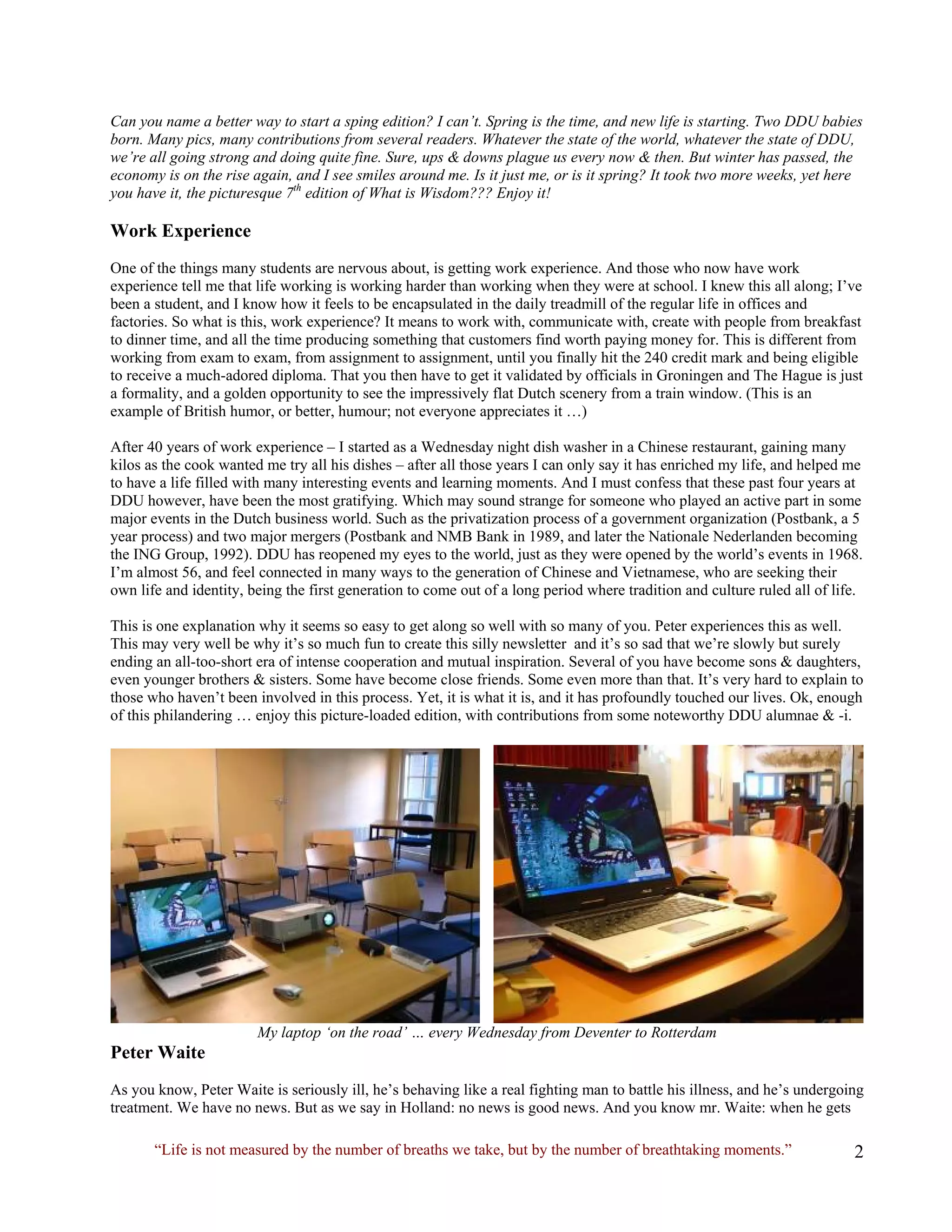 The document discusses different perspectives on the concept of wisdom. It notes that wisdom involves realizing that reality has many perspectives. It then provides a summary of a newsletter dedicated to members of the DDU family that includes photos, guest contributions, and updates on DDU and its alumni. It discusses the experience of work and how the author's time at DDU has reopened his eyes to the world.