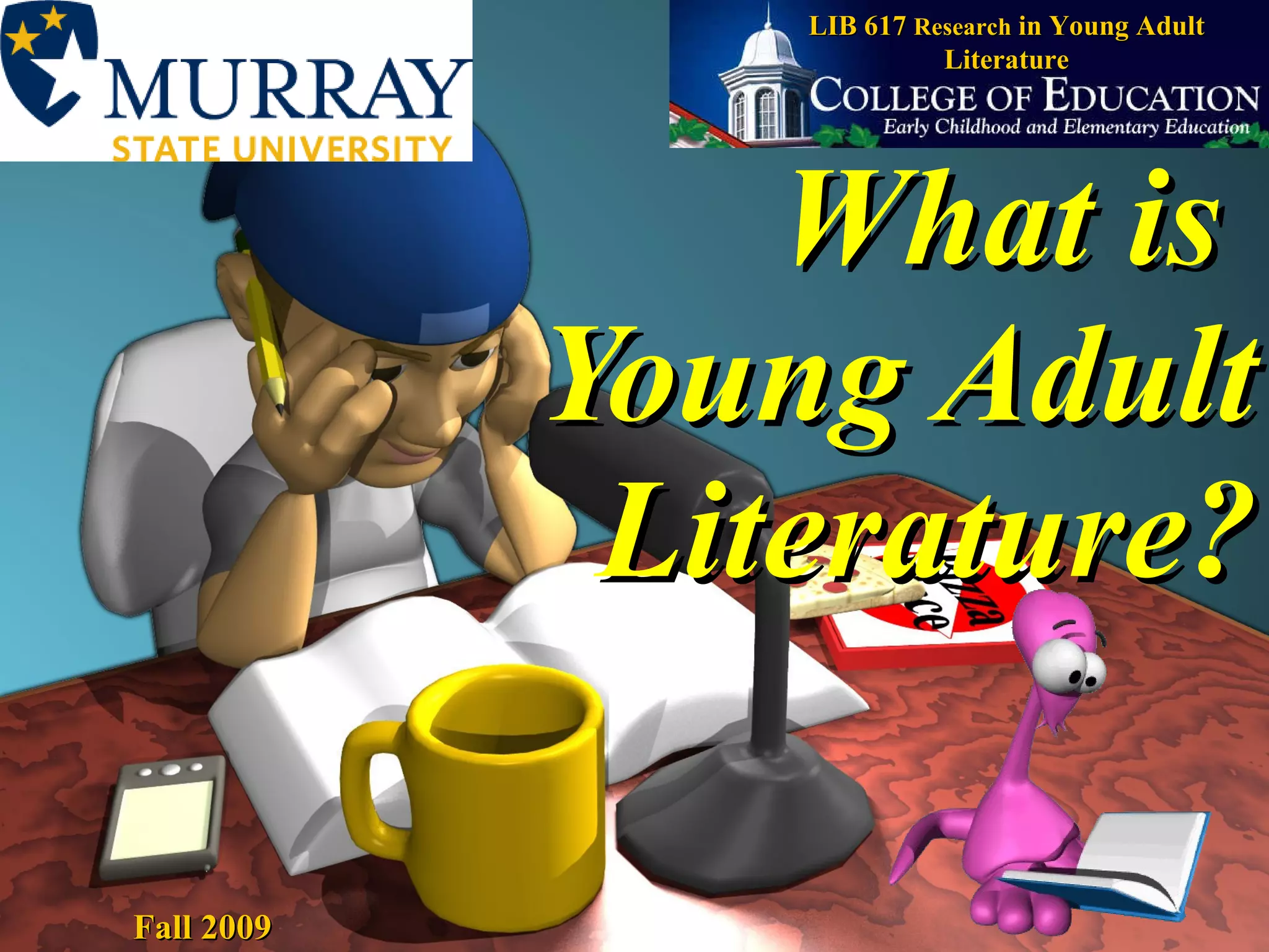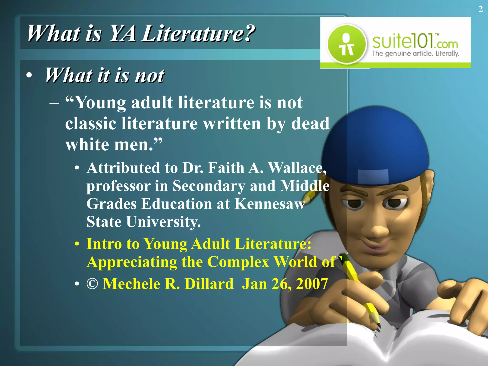 Young adult literature refers to books written for teenage audiences that usually feature teenage protagonists dealing with common issues of adolescence such as belonging, relationships, and future plans. While traditionally focused on readers ages 12 to 18, the definition has expanded to include some books for readers as young as 10 and occasionally up to age 35. Characteristics of YA literature include fast pacing, direct dialogue, sparse language, and optimism.