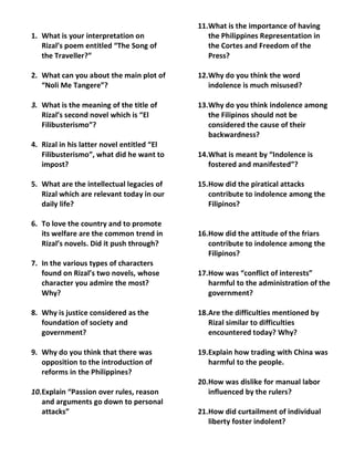 This document contains 74 questions related to Jose Rizal's life, works, and ideas. The questions cover topics such as interpretations of Rizal's poems and novels, the intellectual legacies of Rizal, characters in his novels, the importance of justice and reforms, and Rizal's views on the future of the Philippines.