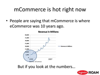 - mCommerce transactions are growing 5 times faster than eCommerce and have the potential to exceed $1 trillion by 2014 as smartphones proliferate. However, security concerns and poor user experiences have held back mCommerce adoption in the US.