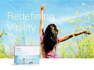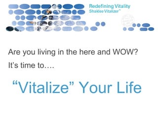 The document discusses a vitality quiz that rates daily energy, immune system strength, appearance, stress management, and diet on a scale of 1 to 5. It then introduces the Shaklee Vitalizer supplement, claiming it provides 80 bio-optimized nutrients clinically proven to support longer, healthier lives. It highlights findings from a 50th anniversary landmark study showing long-term Shaklee supplement users had better health biomarkers than non-users. The Vitalizer is said to contain the right nutrients delivered with Shaklee's S.M.A.R.T. technology to the right places at the right times.
