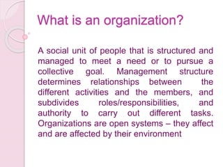 An organization is a social unit of people that is structured and managed to meet a need or pursue a collective goal. Organizations have management structures that determine relationships between activities and members, and divide roles, responsibilities, and authority. Organizations interact with their external environment. The document then lists and describes 9 common types of organizations: large companies, public utilities, government agencies, franchise networks/chains, private hospitals/schools, not-for-profit businesses, small companies, cooperatives, and small associations/charities.