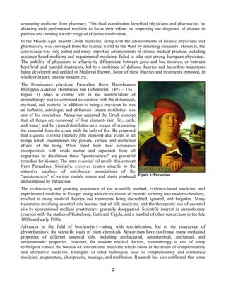 Aromatherapy involves the use of essential oils extracted from plants to treat illnesses or provide relaxation. It has ancient roots but was coined in the 1930s. Essential oils have various medicinal properties and were used by ancient Egyptians, Greeks like Hippocrates, Romans, and Persian physician Avicenna who improved distillation methods. In the Middle Ages, aromatherapy had esoteric and religious associations and was used alongside herbalism. Modern aromatherapy research since the 1920s has confirmed some therapeutic properties but it is still considered alternative medicine.