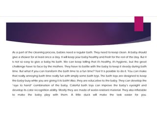 Bath toys are designed to keep babies occupied during bath time. They are often made of inflatable, water-resistant materials like plastic or rubber. Colorful bath toys can help improve babies' eyesight and color recognition ability while also making the bath more fun. It is important to clean bath toys regularly to prevent mold growth, as they are subject to mold when made of materials like plastic that bath water can get trapped inside of. The cleaning process involves drying the toy, using a vinegar solution to clean inside parts, washing outer surfaces with dish soap, and drying completely.