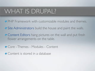 Drupal is a PHP content management framework that allows customizable content, modules, and themes. Site administrators use Drupal to build websites while content editors add and organize content. Drupal powers many large websites and has a worldwide community of over 16,000 developers. The document provides an overview of installing Drupal, using common features like nodes, views, and taxonomy, and lists resources for learning more.