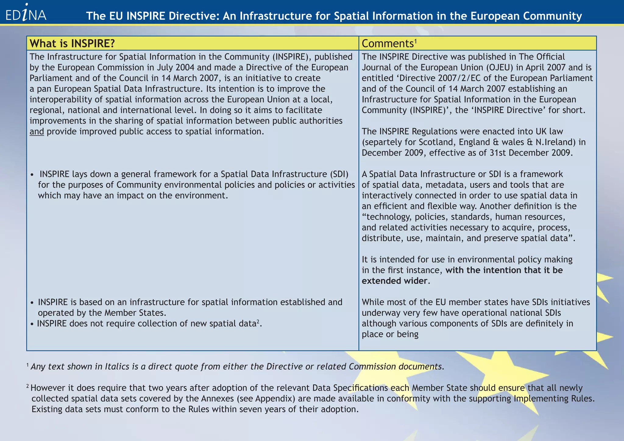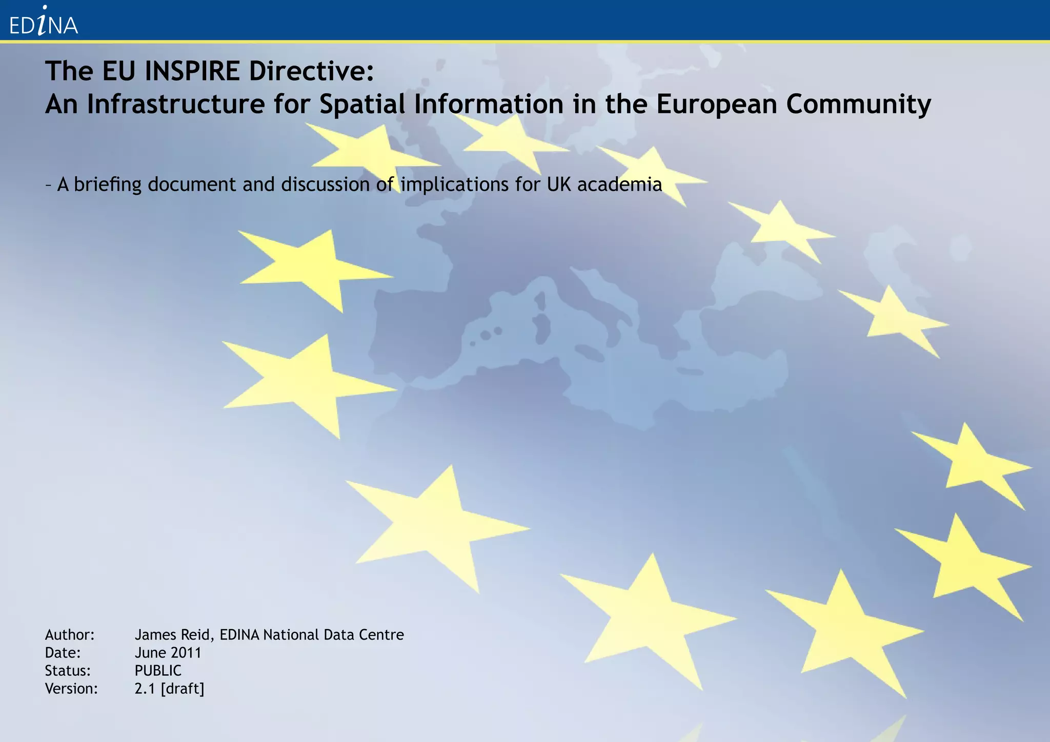 The document discusses the EU INSPIRE Directive, which aims to create a pan-European infrastructure for spatial information. The directive seeks to improve data sharing across public organizations and provide better public access to spatial data. It requires that member states establish network services to allow discovery, viewing, downloading and transformation of spatial datasets. When fully implemented, INSPIRE will facilitate combining spatial data across borders to support environmental and other policies.