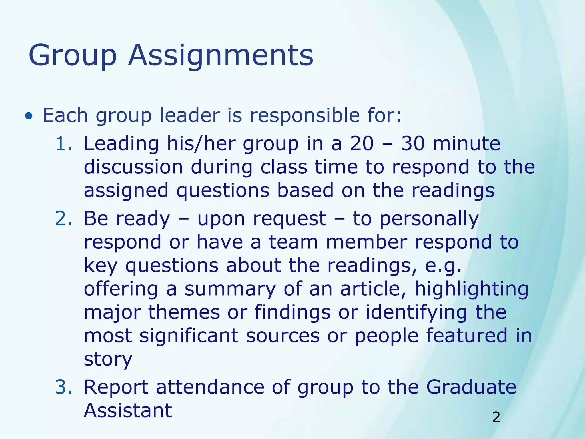 1. Group assignments for a journalism class - students will lead discussions on assigned readings and be prepared to summarize articles.