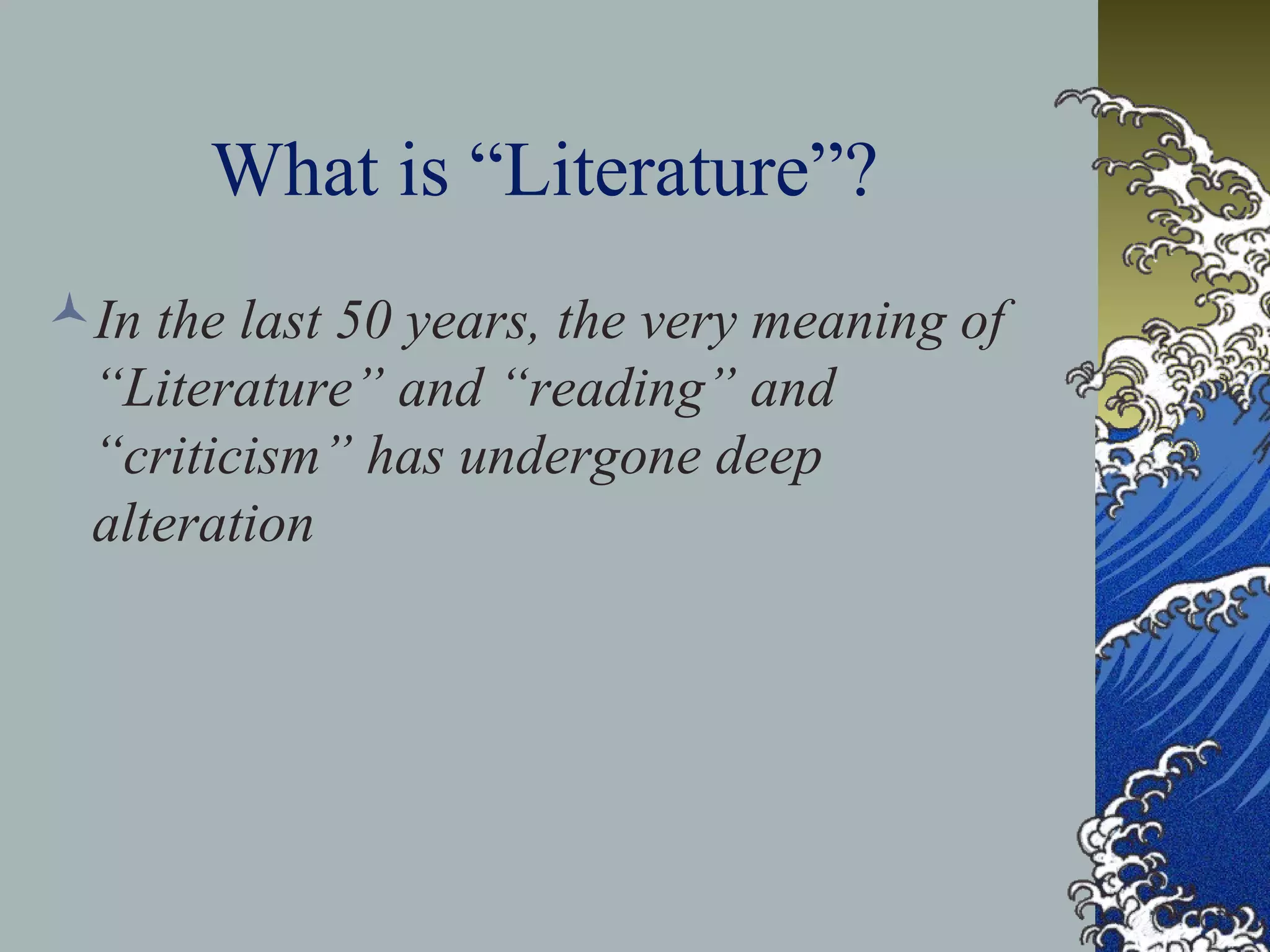 This document discusses the evolving definition of "literature" over the last 50 years. Traditionally, literature referred to imaginative writing that was not factual, but many classical works were also non-fiction. The document argues that what makes a text "literary" is subjective and dependent on how people relate to it. It was traditionally based on language use but this excluded many texts. The literary "canon" was constructed by those in power to include mainly works by white European males, marginalizing other groups. There is no objective value or essence to literary works and their status changes over time based on changing social contexts and readers.