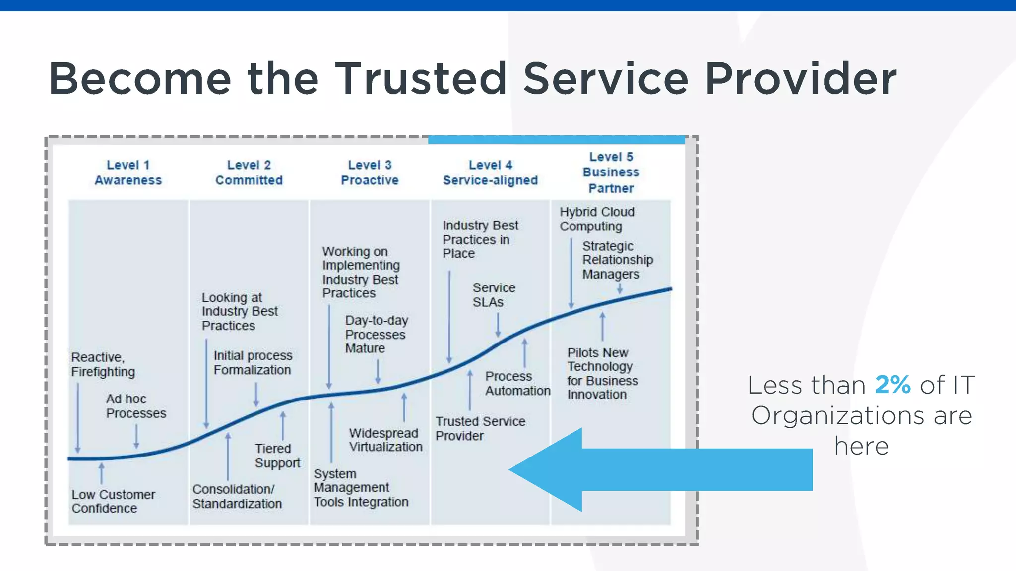 #5 You want to be an IT service provider to the business – and achieve the long coveted service-aligned IT maturity level. This is model many IT organizations are very familiar with, and despite their best efforts, almost 90% are at the reactive or proactive stage.