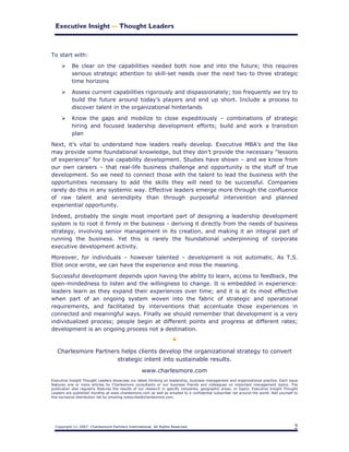 CEOs are increasingly concerned about leadership capabilities, with many believing their management teams may not meet future challenges, despite satisfaction with current strategies. A significant shortage of leadership talent is anticipated due to retirements, and companies need to prioritize leadership development as integral to their business strategy to ensure sustainable growth. Effective leadership development should be rooted in real business challenges, tailored to individual progress, and integrated into organizational practices.