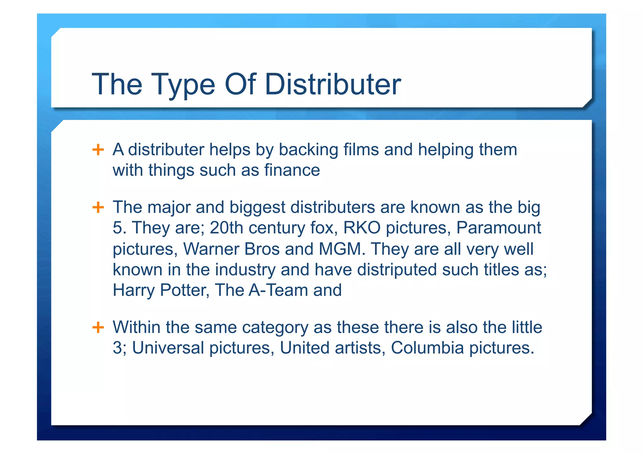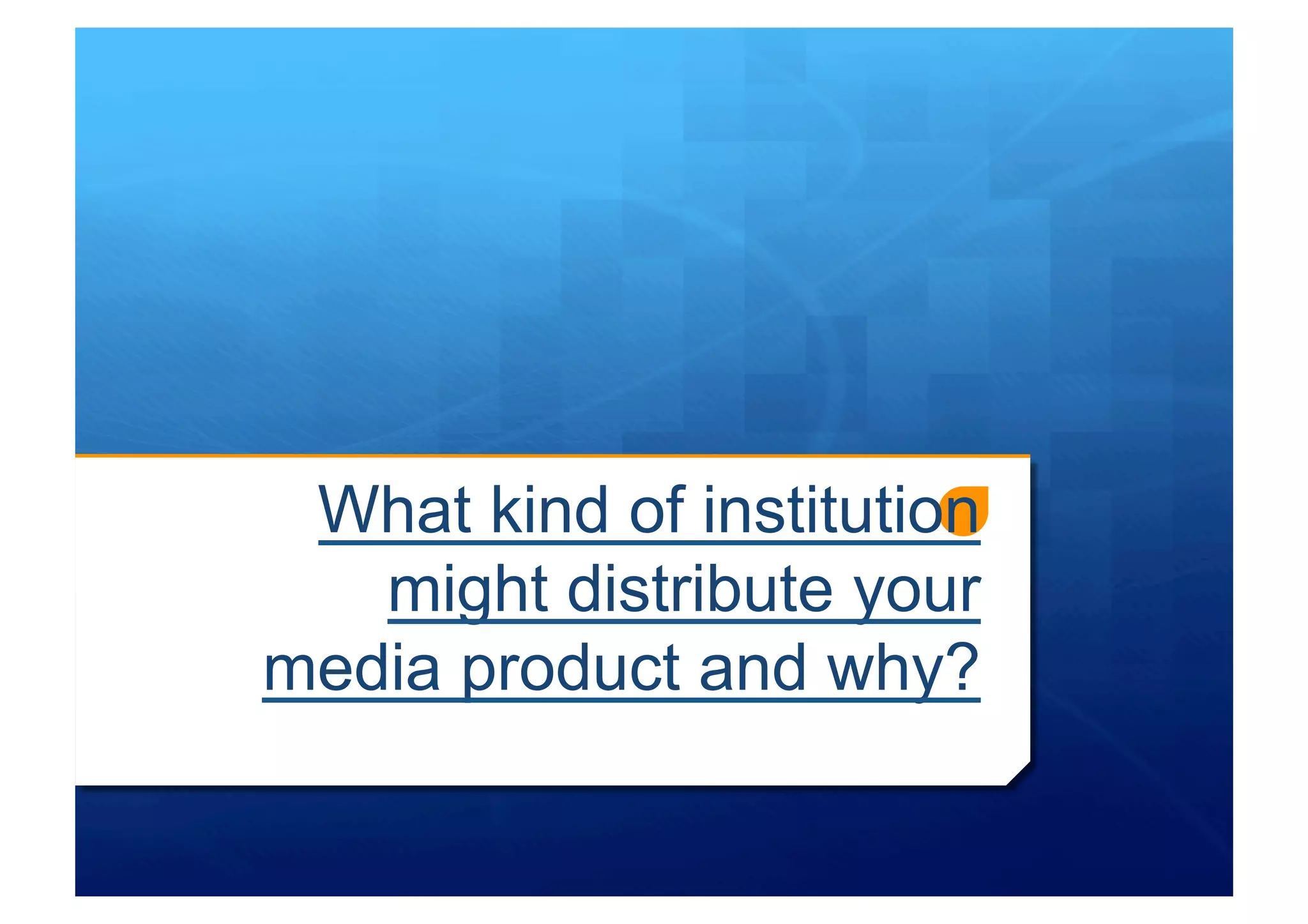 A small independent film distributor would be best suited to distribute the media product discussed in the document. Small indie distributors are more willing to take risks on small, independent films that major distributors avoid, as they have less to lose if the film fails. Specifically, DogWoof Films and Entertainment Film Distributors are recommended as they are small distributors of independent films that could help distribute the product despite its small budget and higher risk of failure.