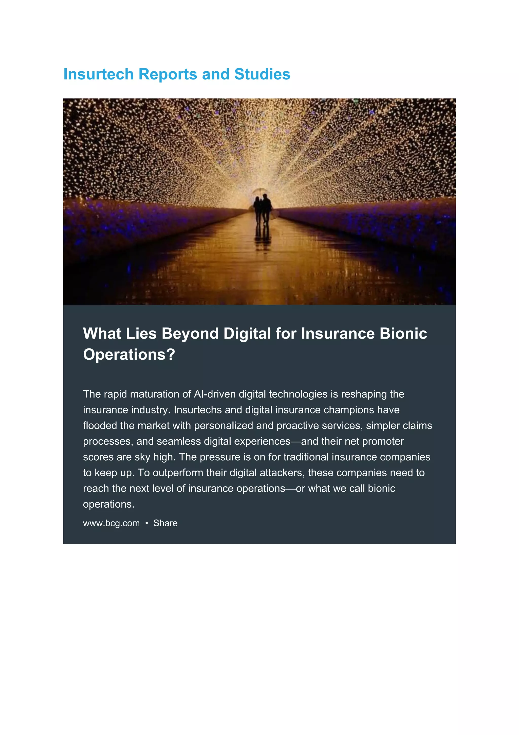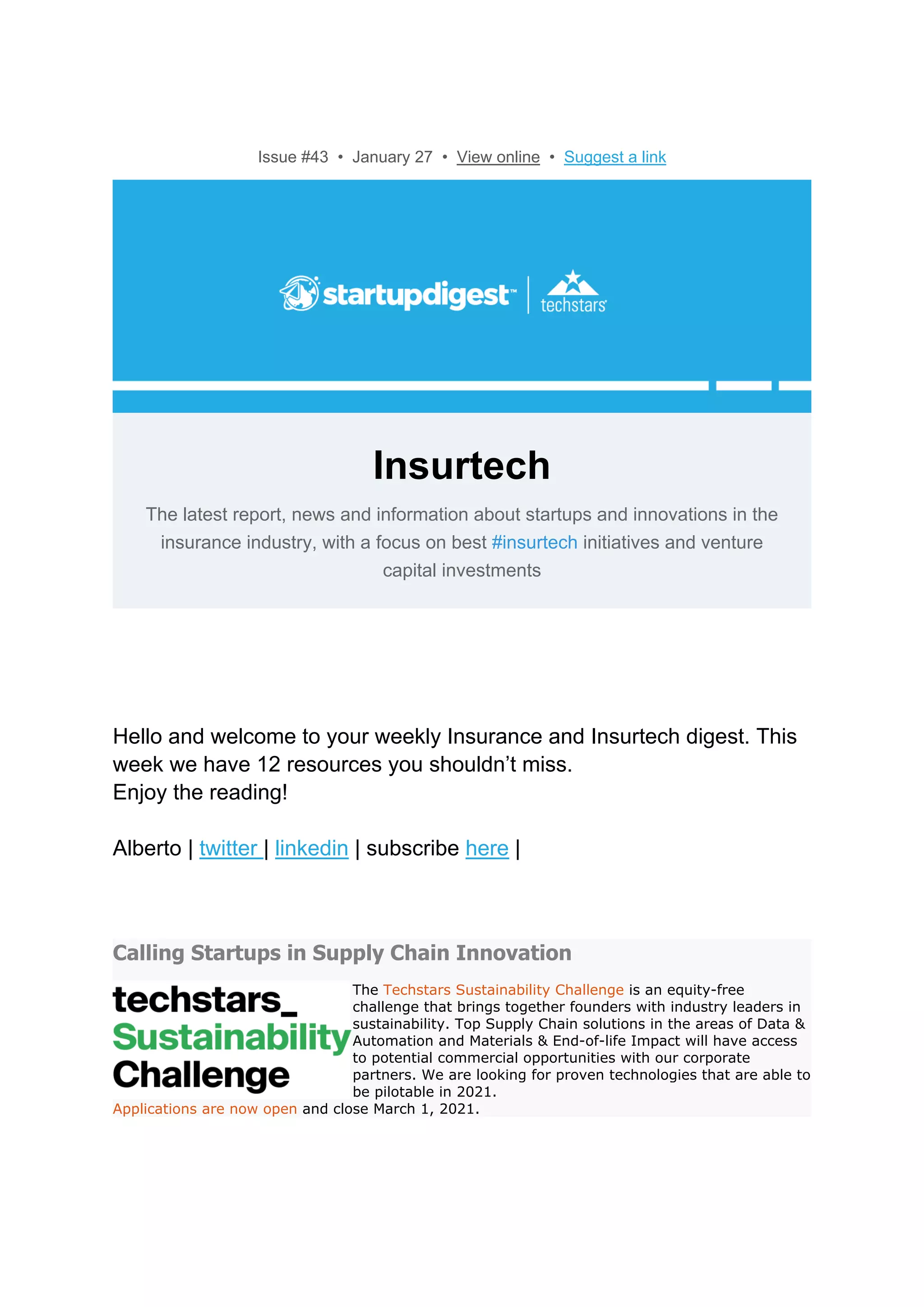This document is a digest focusing on the latest news and insights in the insurtech industry, emphasizing innovations and investment opportunities. It discusses the evolving landscape of insurance, including the shift towards digital and AI-driven operations, and highlights a call for startups in supply chain innovation. Key topics include regulatory developments, investment trends, and articles to watch in the field, as well as a post about autonomous trucks making deliveries.