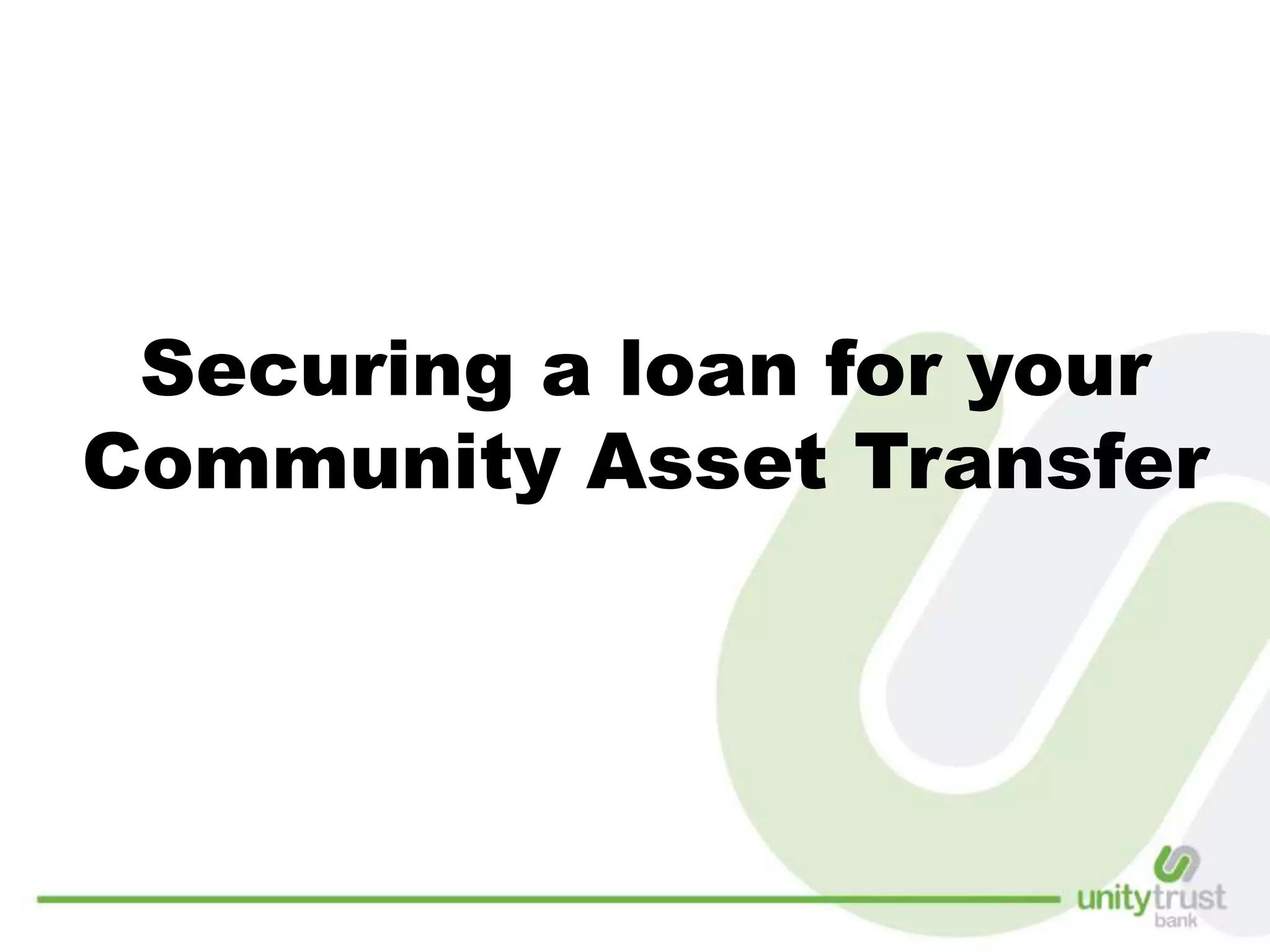 This document discusses securing loans for community asset transfers. It outlines why organizations may want to use loan finance, what loans can be used for, and what lenders look for in loan applications. Lenders want to ensure they can get repaid, so they assess risks using the "CAMPARI" method of evaluating a borrower's character, ability to repay, margins, purpose of the loan, amount of the loan, repayment sources, and any insurance like security. The document also reviews the pros and cons of loans, factors for organizations to consider, and the process that occurs after a loan is approved.