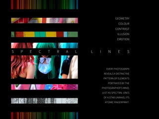 The document appears to be a collection of photography titles and captions. It includes over 100 titles related to various photographic elements, techniques, subjects, and themes. The titles are organized under headings that explore topics like geometry, color, contrast, imagination, and more. Each title suggests the conceptual or visual emphasis of the unnamed photographs.