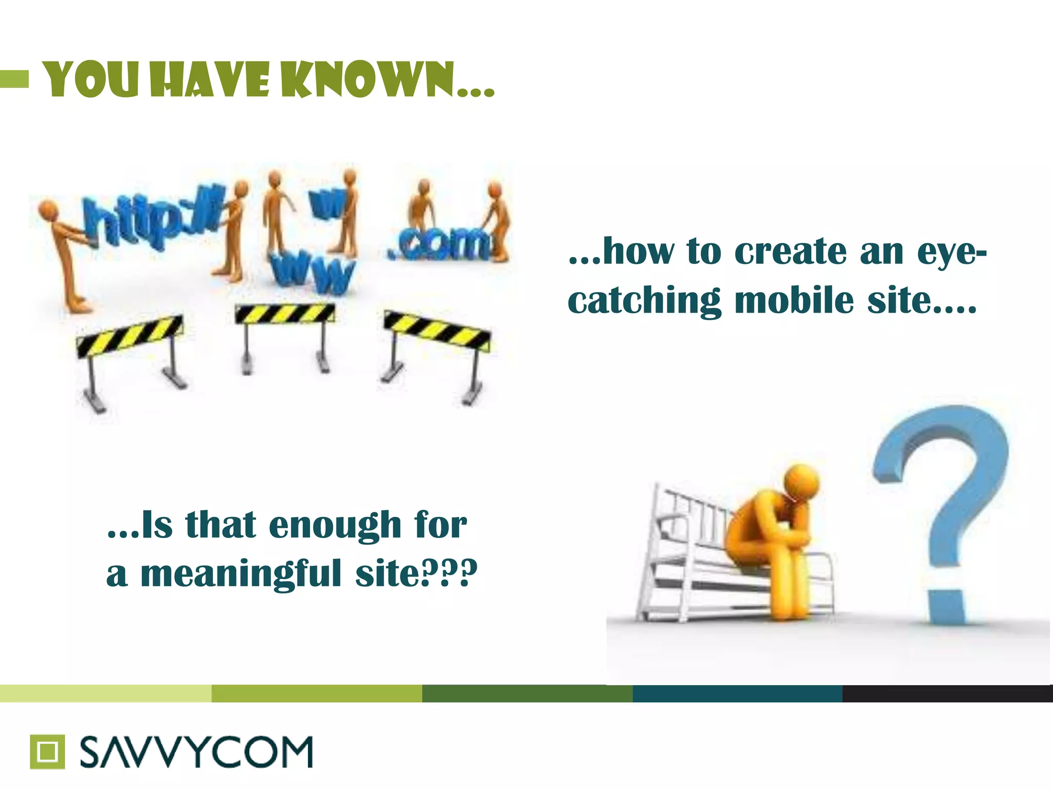 The document outlines essential elements for creating an effective mobile site, emphasizing the importance of displaying key information, ensuring ease of use for touch-screen devices, and optimizing loading speed. It suggests organizing content to facilitate user searches and providing interactive features like addresses and online purchasing options. The overall message encourages quick and effective implementation of these best practices.