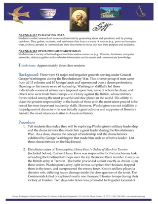 This lesson plan explores George Washington's leadership as commander-in-chief during the Revolutionary War through analyzing his relationships with generals like Henry Knox. Students will discuss Washington's leadership characteristics, examine primary documents about key battles like Trenton, and research a general to determine if they displayed leadership. The documents include Henry Knox's orders for the Battle of Trenton, a painting of Washington rallying troops at Monmouth, and a memoir describing Washington's emotional farewell to generals.