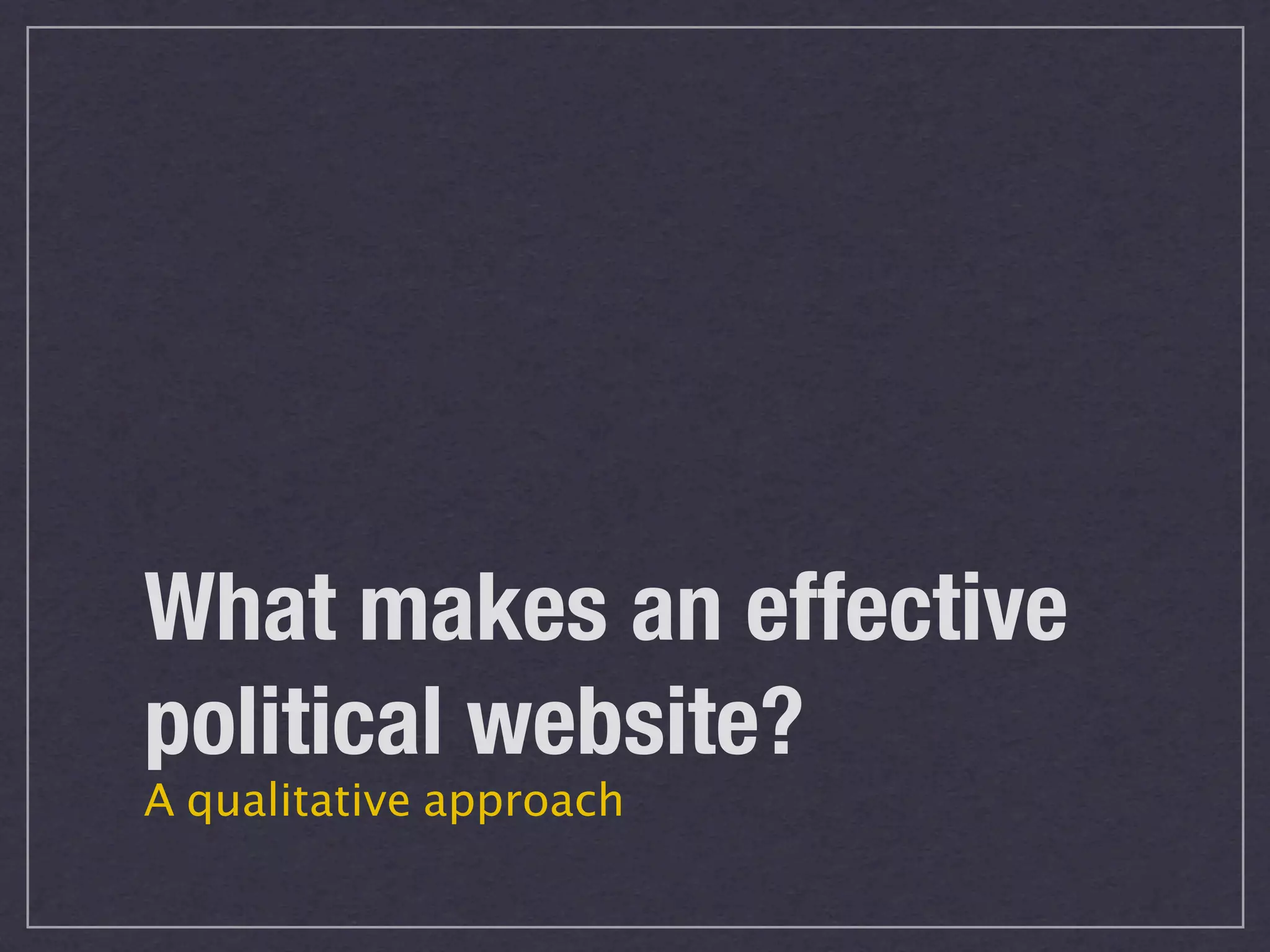 This document discusses the attributes of an effective political website, advocating for a qualitative assessment based on user needs rather than just quantitative metrics like website traffic. It emphasizes the importance of delivering valuable information to key audiences, effective design, and user engagement while considering the political context. Additionally, it highlights the necessity of an integrated online strategy that aligns the website with social media and other online resources to support communication goals.