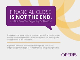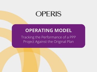 The document discusses the importance of operating models in tracking the performance of public-private partnership (PPP) projects during their operational phase. It highlights how these models support performance updates, invoice reconciliation, and financial forecasting for stakeholders like bondholders and project sponsors. Furthermore, it promotes the availability of an easy-to-use PPP operating model template from Operis, which can be customized for specific project needs.