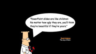 This document provides tips for creating effective presentations. It discusses the different types of presentations, including pitches that are 30 seconds, 3-5 minutes, or 10+ minutes. It emphasizes keeping presentations simple, using visuals appropriately without clipart or comic sans, and not being afraid of whitespace. The document also gives public speaking tips, such as making eye contact, finding the right spot in the room, using your voice and rhythm effectively, and having fun.