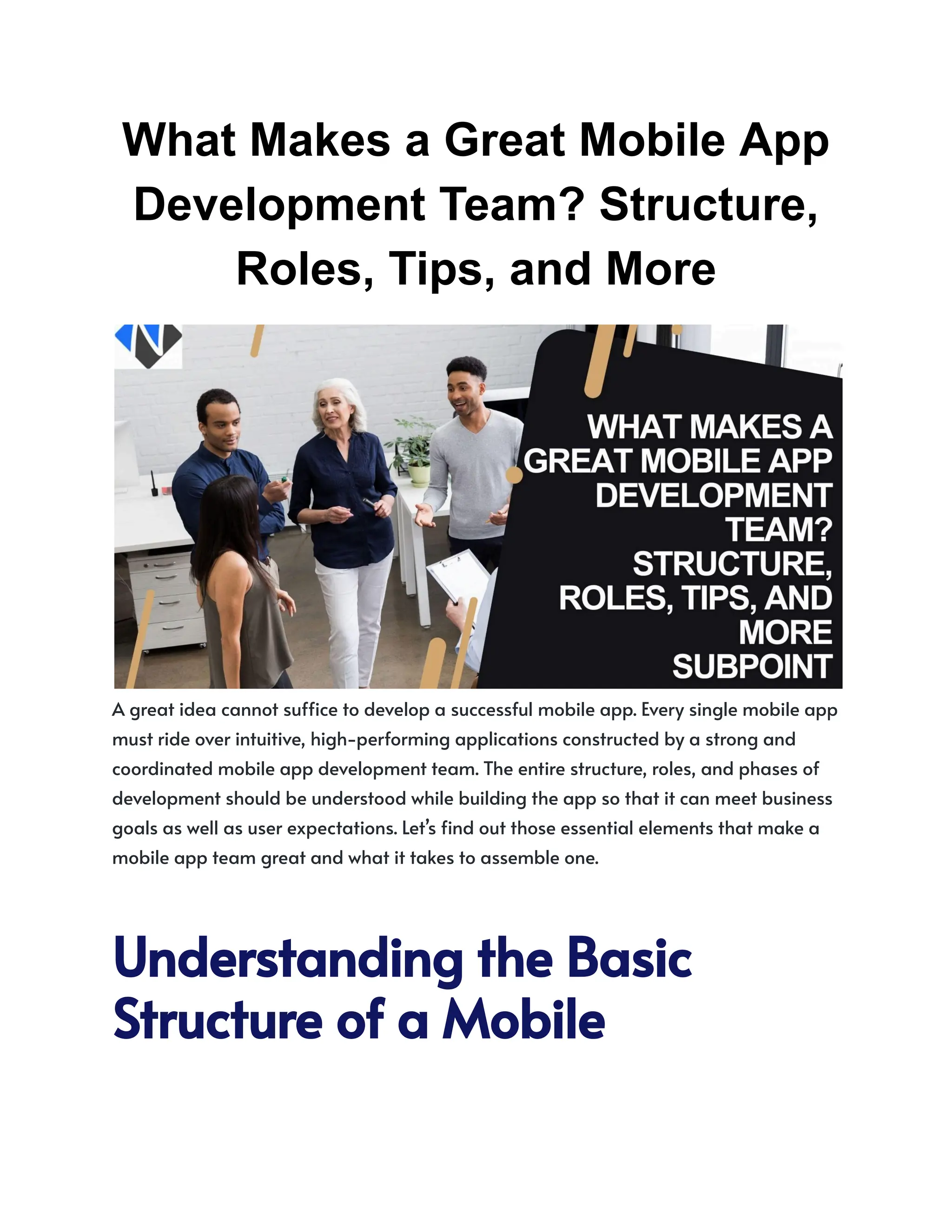 Discover the key elements of a successful mobile app development team—its ideal structure, essential roles, and expert tips for collaboration and efficiency. Learn how to build a high-performing team that delivers innovative, user-centric apps on time and within budget.