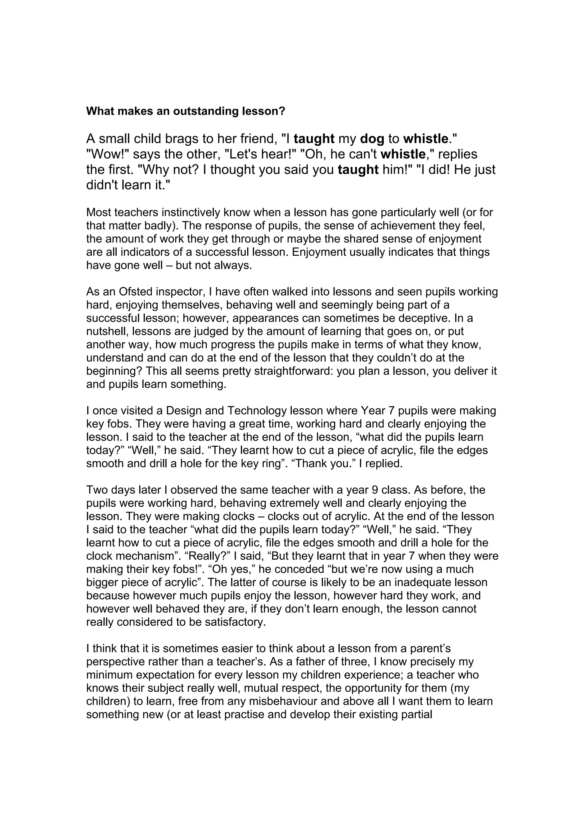 The document discusses what makes an outstanding lesson according to Ofsted criteria. It provides examples of lessons that were judged to be good or outstanding. An outstanding lesson is learner-focused, has clear and challenging learning objectives shared with students. It includes excellent planning and resources, opportunities for assessment and peer/self-assessment, brisk pace with sufficient time for thinking, varied teaching styles, enthusiastic teaching, and ensures all students make progress in their learning.