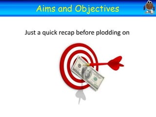 This document provides an introduction to business objectives. It begins with multiple welcome messages and then defines business objectives as measurable targets for achieving business aims. Objectives are divided into two categories: financial and non-financial. Financial objectives include goals related to profits, market share, and sales. Non-financial objectives include personal satisfaction, independence, and helping others. The document states that objectives give businesses clear targets and allow them to plan and measure progress. It also briefly introduces the topics of smart objectives and the next lesson before concluding.