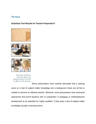 This document summarizes research on teacher preparation and effectiveness. It finds that high-quality teacher preparation helps develop essential teaching knowledge and skills, increases student achievement, and reduces teacher turnover. Studies show that subject knowledge alone is not enough to be an effective teacher - pedagogical training is also important. The research supports comprehensive teacher preparation programs and professional standards to ensure teacher quality.