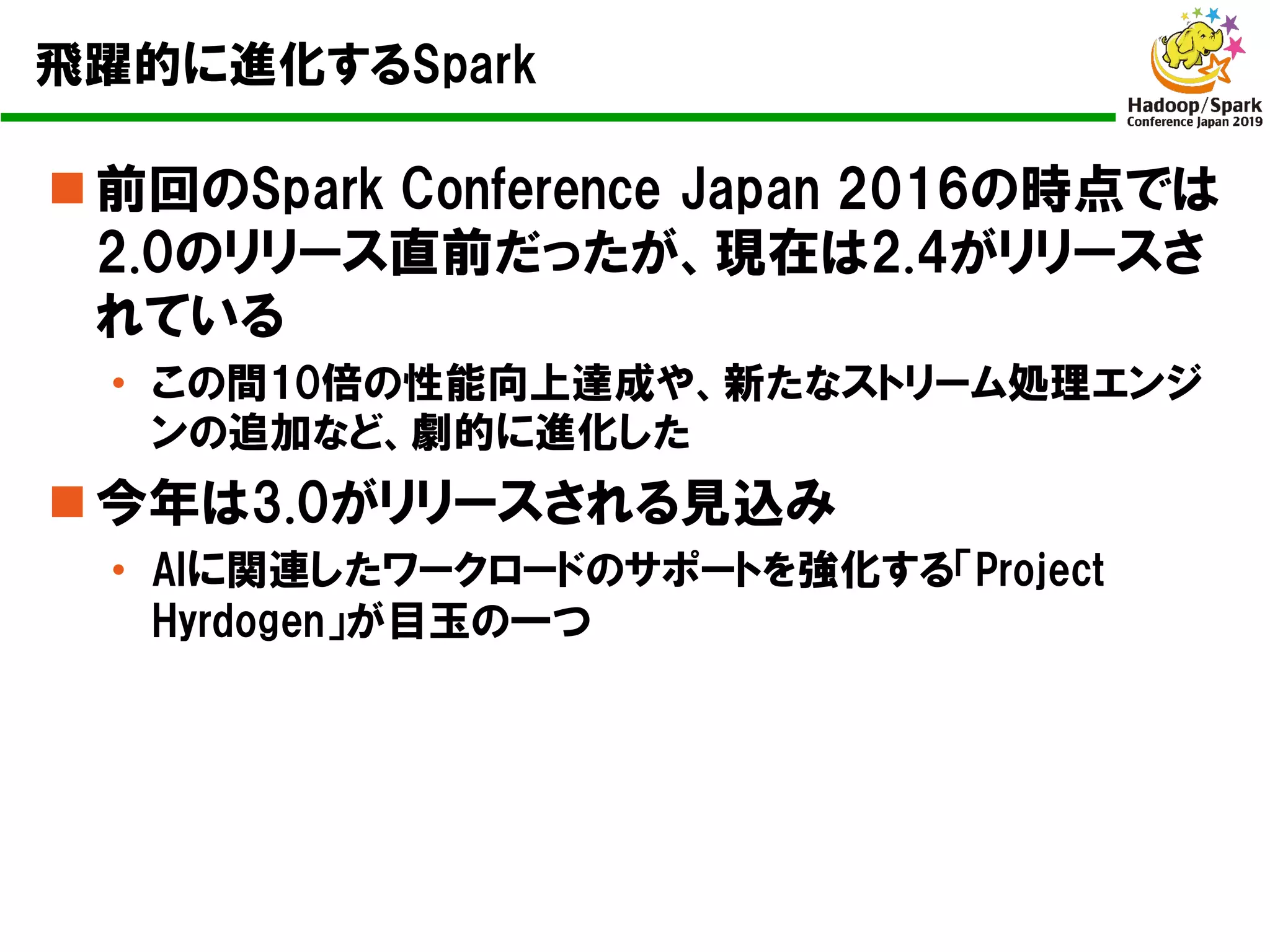 Hadoop / Spark Conference Japan 2019 『What makes Apache Spark?』 日本Hadoopユーザー会 猿田 浩輔(Apache Sparkコミッタ、NTTデータ)