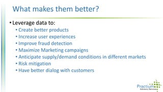 Data-driven organizations are better able to create better products, increase user experiences, improve fraud detection, maximize marketing campaigns, anticipate supply and demand conditions, mitigate risks, and have better dialog with customers by leveraging data to systematically support corporate goals and empowering people in the organization to make decisions based on data.
