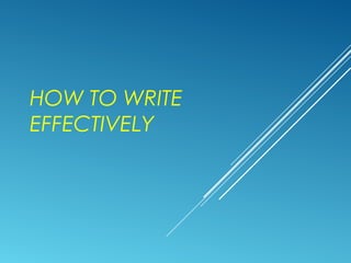 The document discusses how to write effectively and outlines seven key traits of good writing: ideas, organization, voice, sentence fluency, word choice, conventions, and presentation. It emphasizes that good writing has clear, consistent ideas that flow in a logical progression from point to point. It also stresses developing one's writing by reading widely, noticing what works and doesn't work in different styles of writing, and practicing revising weak writing.
