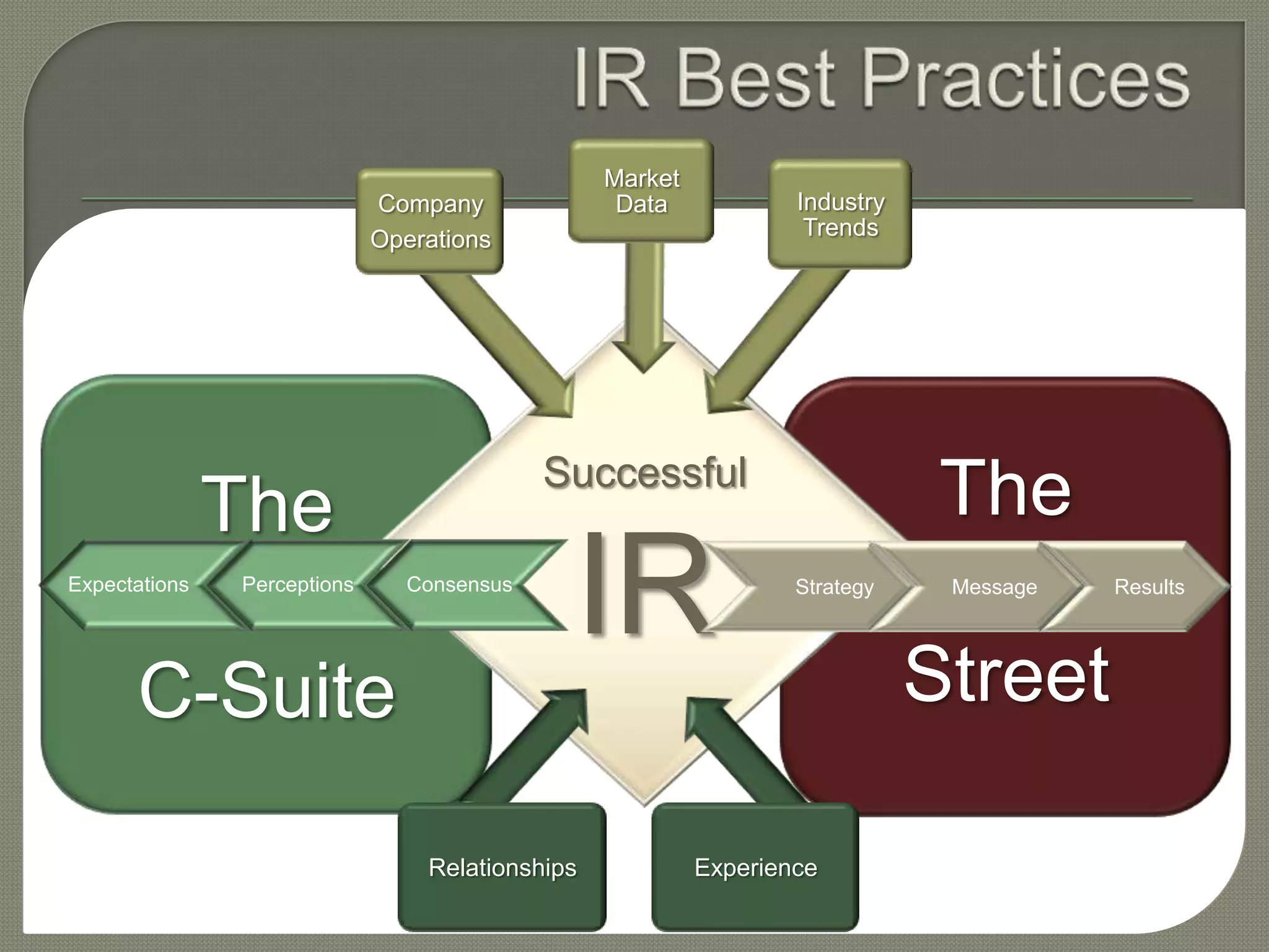 This document discusses best practices for investor relations, including having experience, building relationships with the C-suite and Wall Street, managing expectations and perceptions through consistent strategy, messaging, and focusing on results.