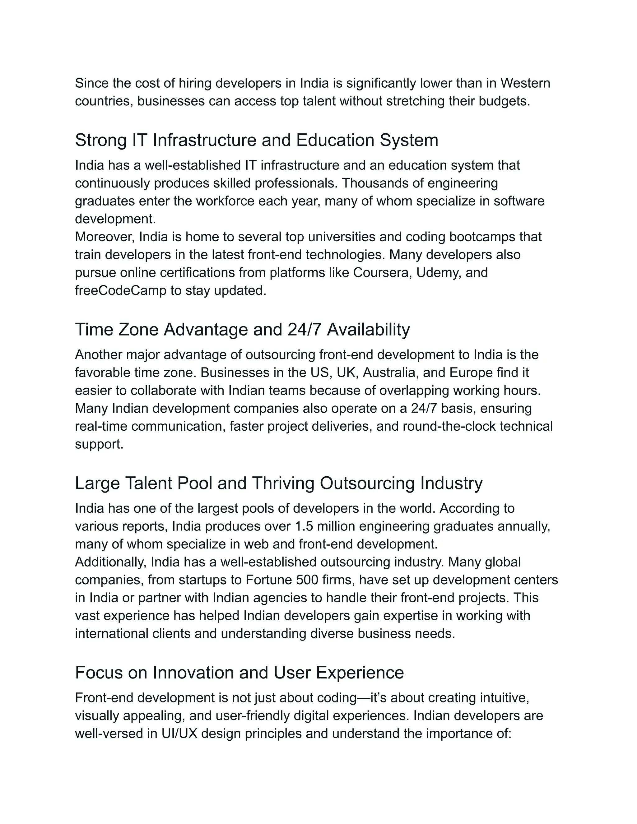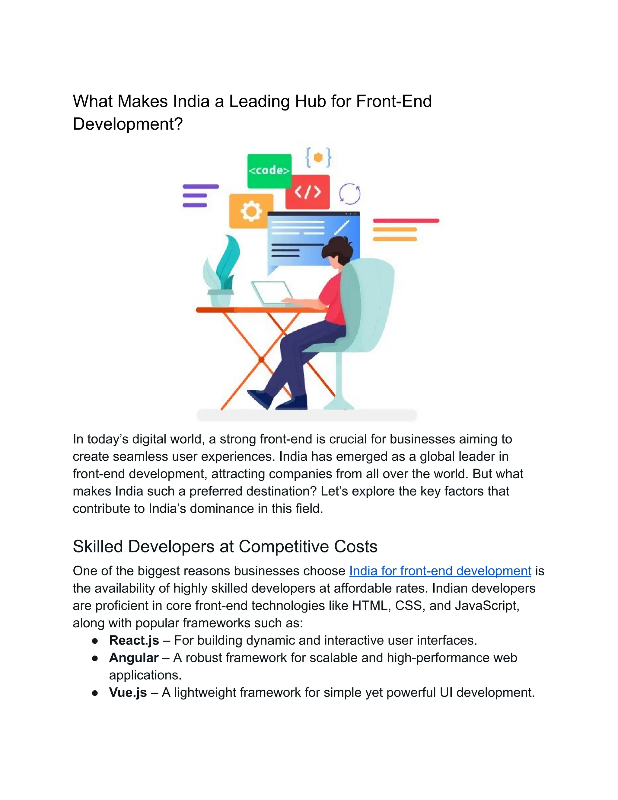 India is a global hub for front-end development due to its skilled, cost-effective workforce, strong IT infrastructure, and a continuous supply of tech talent. With expertise in modern frameworks, 24/7 availability, and a focus on innovation, Indian developers deliver high-quality, user-friendly digital experiences efficiently.
