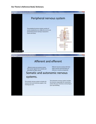 The document repeats the phrase "Our Theme is Reference Book/dictionary" multiple times and provides two pictures without captions or context. It then discusses how voluntary muscle movement takes longer for the brain to signal than involuntary movement caused by tendon stimulation, and cites research finding the speed of involuntary movement to be 100m/s on average based on repeated tests of multiple people.