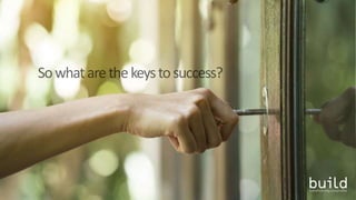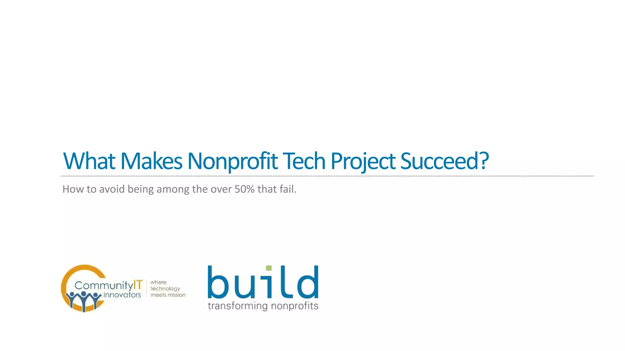 The document discusses the factors contributing to the success of nonprofit tech projects, noting that over 50% of such initiatives fail due to lack of organizational alignment with technological advancements. It emphasizes the importance of active executive sponsorship, collaborative planning, and effective change management to enhance project outcomes. Resources and further learning opportunities from Build Consulting are also mentioned.