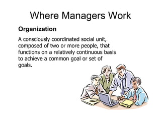 The document discusses various topics related to management functions and concepts. It defines what managers do, where they work, and common management functions like planning, organizing, leading, and controlling. It also discusses organization structures, management trends like delegation and empowerment, and concepts like job performance, recruitment, groups, and teams.