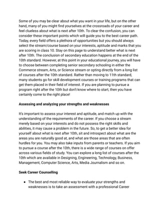 The document provides a comprehensive guide for students deciding their career paths after completing class 10, including a SWOT analysis to evaluate strengths and weaknesses. It outlines various streams such as science, commerce, and arts, along with potential career options and qualifications available within each field. Additionally, it emphasizes the importance of career counseling, personal introspection, and skill development in making informed decisions about future educational and career choices.