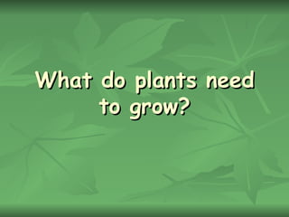 Plants require air, water, light, and nutrients to grow. They breathe in carbon dioxide from the air and absorb water and nutrients from the soil, using these along with sunlight for photosynthesis to produce oxygen and fuel their growth.