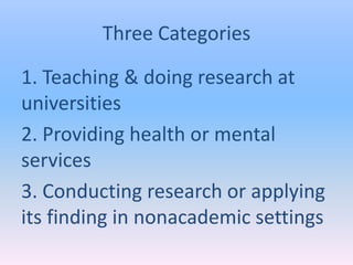 1. Psychologists work in three main categories: teaching and research at universities; providing health or mental services; and conducting research or applying findings in non-academic settings.