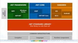 .NET Core is a cross-platform development platform with broad support across various operating systems and devices. The document outlines its features, performance improvements, and new functionalities coming with .NET Core 3, including support for IoT and advanced memory management techniques. It also provides information on deployment types, the .NET Standard API specification, and tools for unit testing and dependency injection.