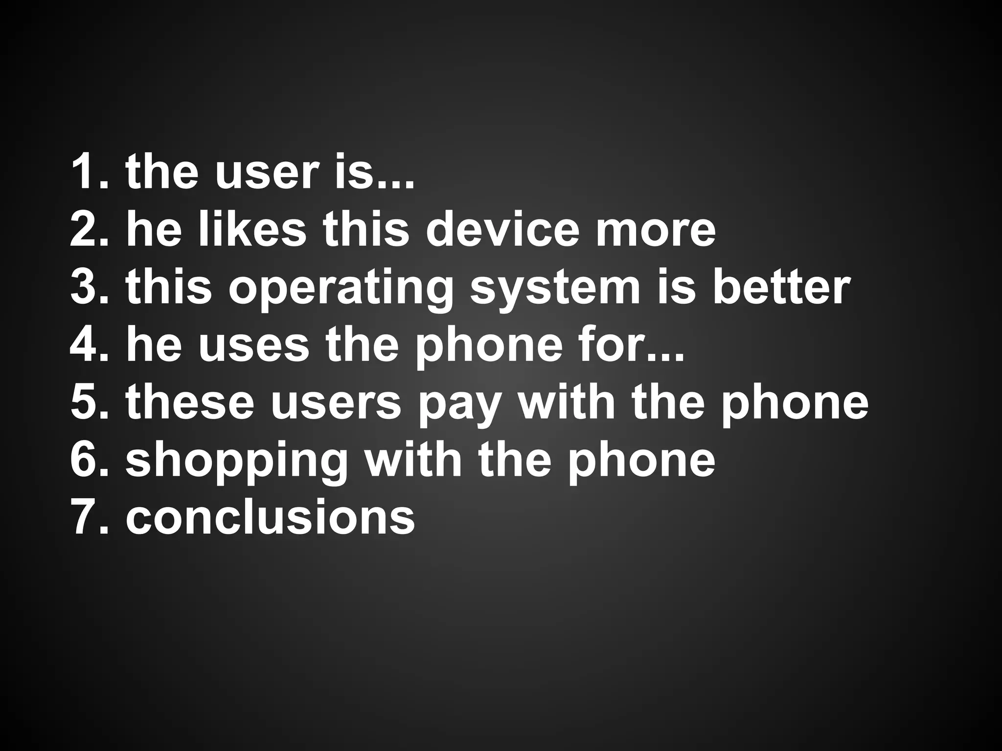 Users want smartphones that allow texting, browsing the web, downloading apps, using social media, and listening to music. Younger users are more likely to download apps, while older users have pre-loaded apps. Android and Apple dominate the OS market. Few users currently make purchases on their phones, but many change buying decisions based on phone comparisons. Younger women are more open to mobile payments.