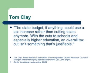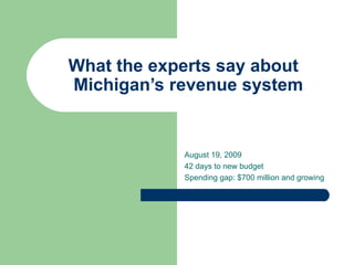 Michigan's revenue system faces a significant crisis, with experts expressing that it is not keeping pace with the economy, leading to a projected $9 billion shortfall in 2010. There is a consensus among financial experts that fundamental reforms in taxation and spending are necessary to address current and future budget gaps, emphasizing the need for increased efficiency in government services. The situation requires immediate attention, as it impacts educational funding and community investments crucial for economic growth.