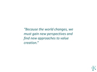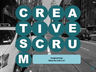 The document introduces the concept of "Imagineering", which is a complexity-inspired design approach for managing change and transformation. It involves strategic innovation through creative exploration of future opportunities and organizational transformation using a real-time, socially constructed approach. Imagineers help organizations shift their focus from outcomes to collaborative processes of co-creation and social change to build environments that allow for constant new initiatives. Their services include co-creating narratives and platforms to generate participation and commitment to change.