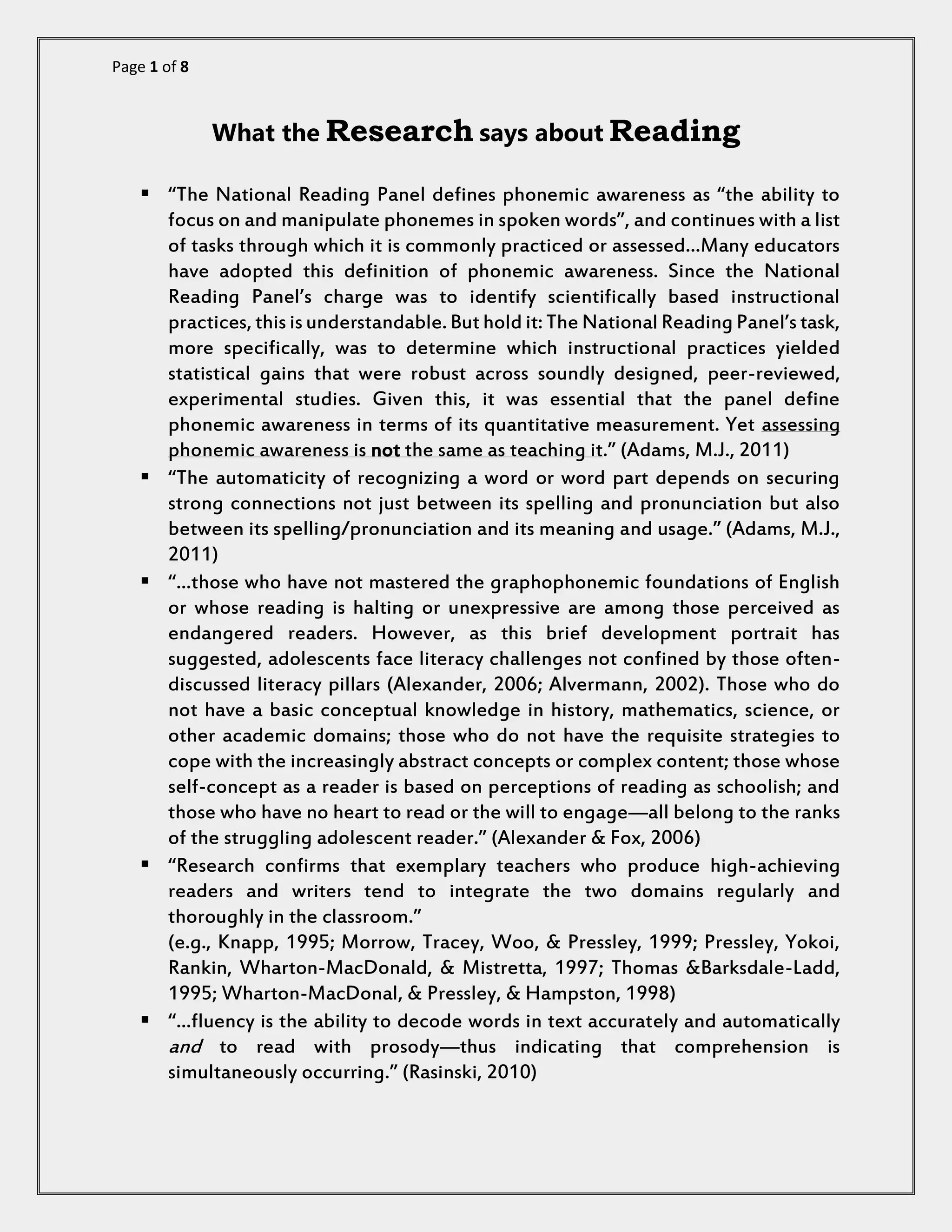 This document summarizes research on reading instruction and literacy development from several scholarly sources: