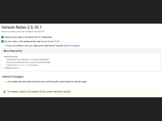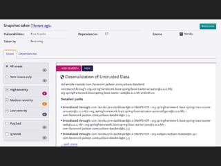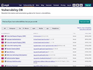 This document discusses the Apache Struts vulnerability CVE-2017-5638 that was exploited in the Equifax data breach of 2017. It provides details on how the vulnerability worked, the timeline of events, and recommendations for preventing similar incidents. These include automating dependency updates, generating dependency reports, using dependency locks, monitoring vulnerability advisories, adding intrusion detection to applications, and implementing security best practices like logging, layered security, and monitoring access patterns. The key message is that organizations must stay vigilant about known vulnerabilities in dependencies and react quickly to patch them.
