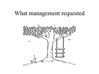 The document outlines the process of a project from the initial request from the user, through management's interpretation, the systems team's design, the programmers' development, and finally the operations team's installation, all with the goal of fulfilling what the original user wanted.