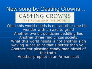 The document discusses what this world needs according to the song "What This World Needs" by Casting Crowns. It says the world does not need more superficial or self-serving religious figures, but rather needs a Savior, Spirit, and Father. It then examines what God's will is for the world based on passages from the Bible, concluding that the world needs God's will to be done on Earth as it is in Heaven. It provides guidance on discerning God's will in one's own life and having the strength to follow it.