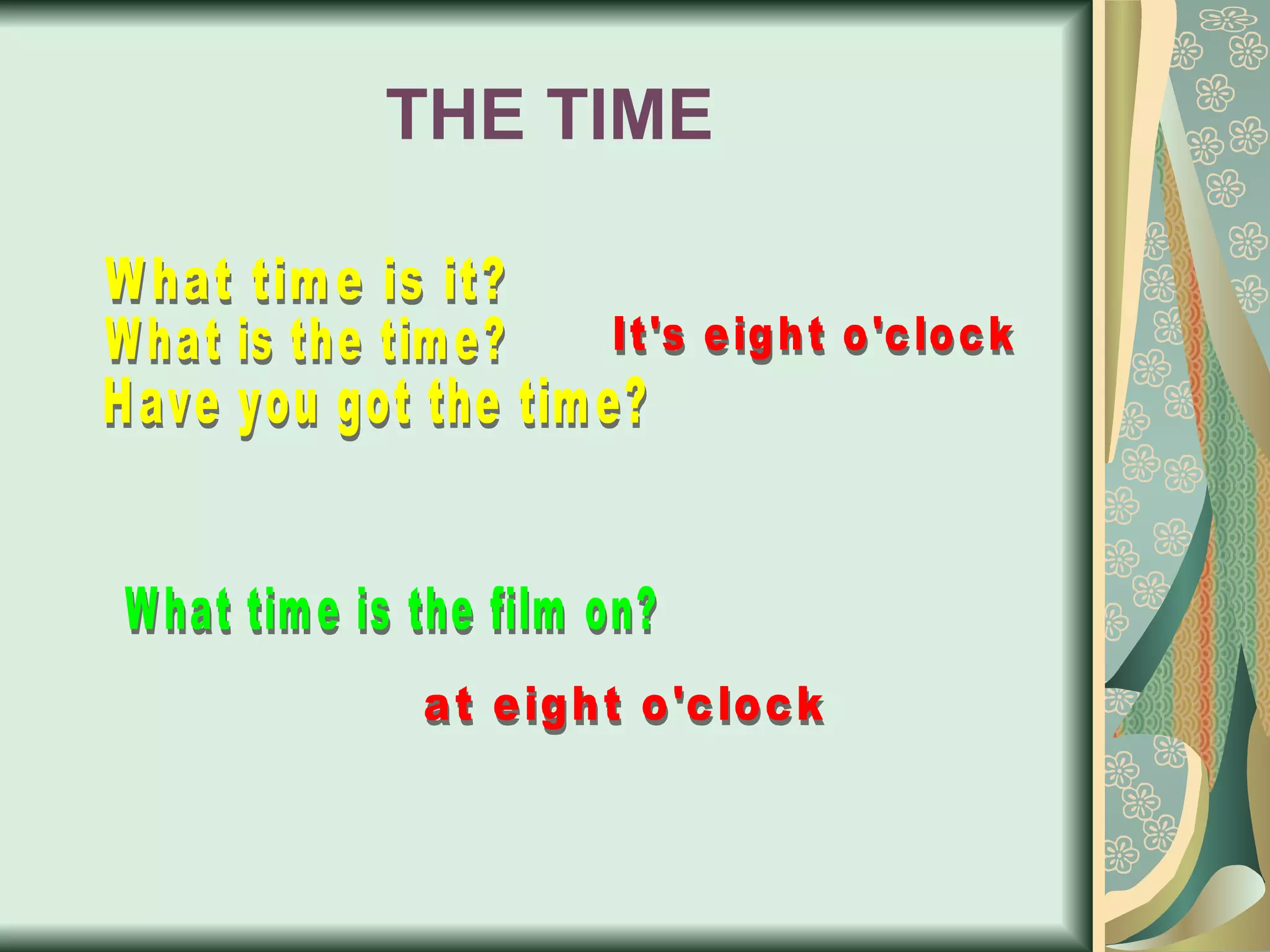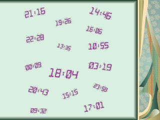 This document provides examples of how to tell time in English. It lists common phrases used to express the time, including "o'clock", "a quarter", "half", "minutes past", and "minutes to". Examples are given for times such as "a quarter past nine", "eight o'clock", and "half past five". Further examples show times such as "ten past eleven", "five past seven", and "ten to four".