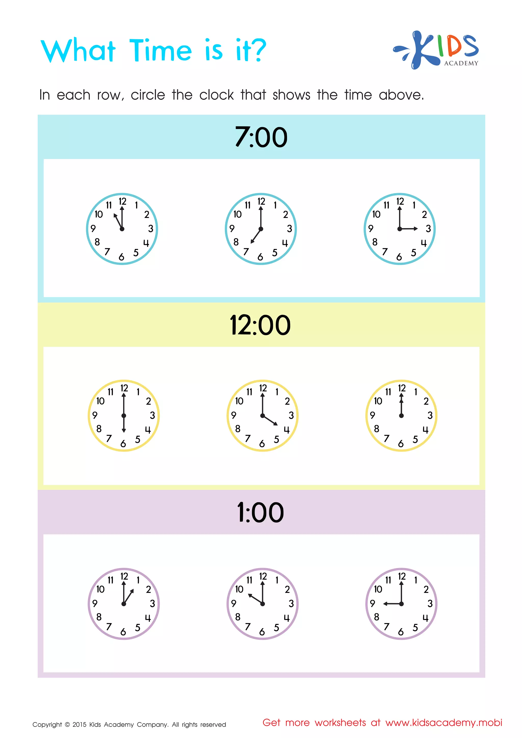 The document contains a worksheet aimed at helping children learn to tell time. It instructs students to circle the clock that corresponds to the given time in each row. The exercise is designed to reinforce time-telling skills in a fun and engaging way.
